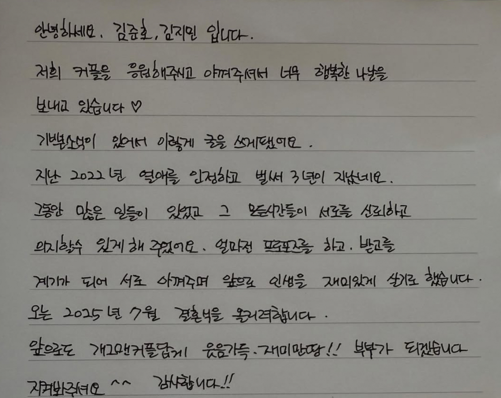 두 사람은 "저희 커플을 응원해주시고 아껴주셔서 너무 행복한나날을 보내고 있습니다. 기쁜 소식이 있어서 이렇게 글을 쓰게 됐어요"라며 "지난 2022년 열애를 인정하고 벌써 3년이 지났네요. 그동안 많은 일이 있었고 그 모든 시간들이 서로를 신뢰하고 의지할 수 있게 해주었어요"라고 전했다.