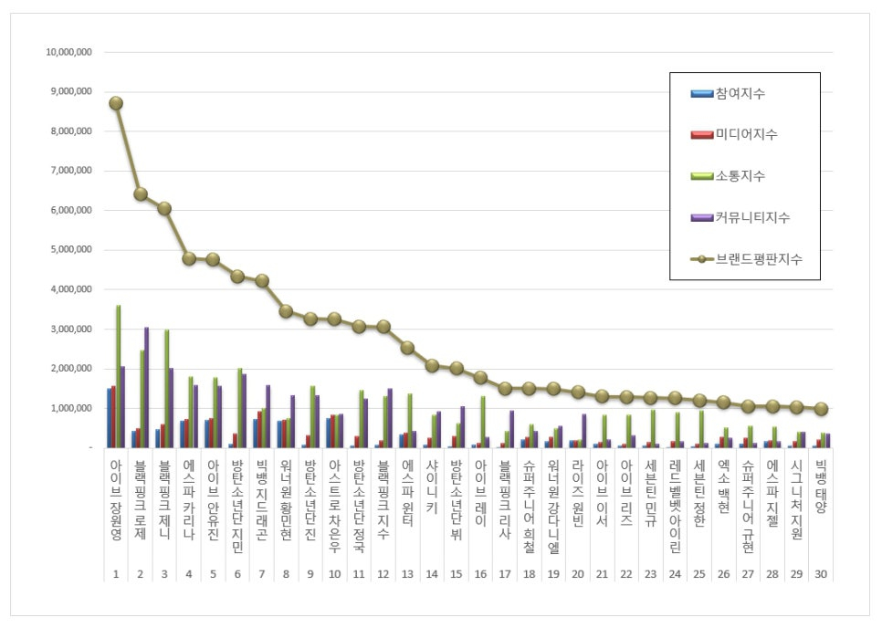 아이돌 개인 브랜드평판 1위를 기록한 장원영 브랜드는 참여지수 1,506,816 미디어지수 1,554,222 소통지수 3,594,220 커뮤니티지수 2,065,156이 되면서 브랜드평판지수 8,720,413으로 분석됐다. 지난 1월 브랜드평판지수 5,171,231과 비교해보면 68.63% 상승했다.