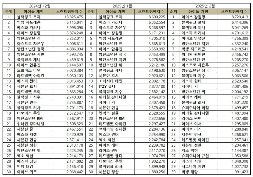 2025년 2월 아이돌 개인 브랜드평판 30위 순위는 아이브 장원영, 블랙핑크 로제, 블랙핑크 제니, 에스파 카리나, 아이브 안유진, 방탄소년단 지민, 빅뱅 지드래곤, 워너원 황민현, 방탄소년단 진, 아스트로 차은우, 방탄소년단 정국, 블랙핑크 지수, 에스파 윈터, 샤이니 키, 방탄소년단 뷔, 아이브 레이, 블랙핑크 리사, 슈퍼주니어 희철, 워너원 강다니엘, 라이즈 원빈, 아이브 이서, 아이브 리즈, 세븐틴 민규, 레드벨벳 아이린, 세븐틴 정한, 엑소 백현, 슈퍼주니어 규현, 에스파 지젤, 시그니처 지원, 빅뱅 태양 순으로 분석됐다.