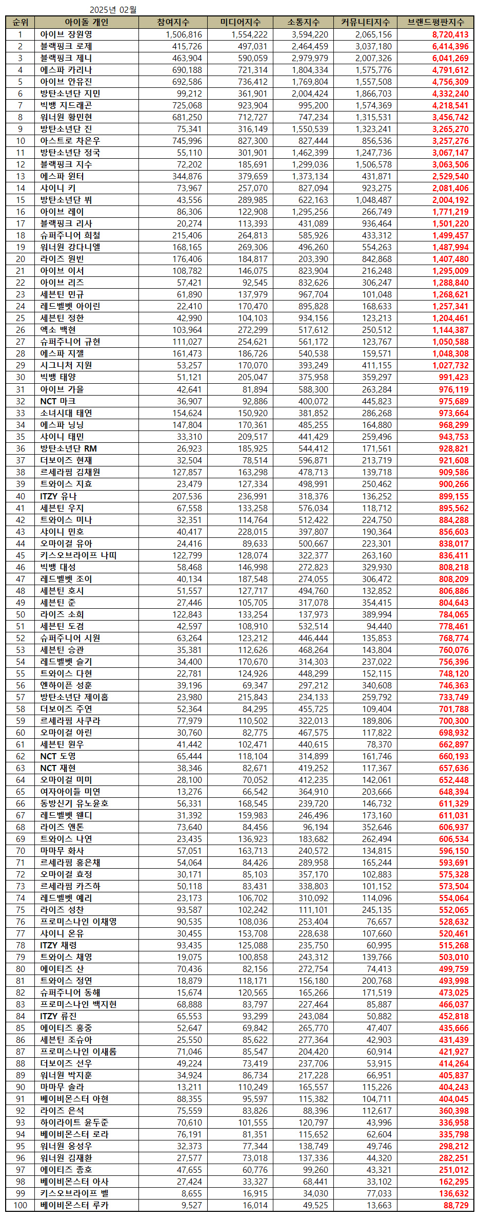 2025년 2월 아이돌 개인 브랜드평판 100위 순위는 아이브 장원영, 블랙핑크 로제, 블랙핑크 제니, 에스파 카리나, 아이브 안유진, 방탄소년단 지민, 빅뱅 지드래곤, 워너원 황민현, 방탄소년단 진, 아스트로 차은우, 방탄소년단 정국, 블랙핑크 지수, 에스파 윈터, 샤이니 키, 방탄소년단 뷔, 아이브 레이, 블랙핑크 리사, 슈퍼주니어 희철, 워너원 강다니엘, 라이즈 원빈, 아이브 이서, 아이브 리즈, 세븐틴 민규, 레드벨벳 아이린, 세븐틴 정한, 엑소 백현, 슈퍼주니어 규현, 에스파 지젤, 시그니처 지원, 빅뱅 태양, 아이브 가을, NCT 마크, 소녀시대 태연, 에스파 닝닝, 샤이니 태민, 방탄소년단 RM, 더보이즈 현재, 르세라핌 김채원, 트와이스 지효, ITZY 유나, 세븐틴 우지, 트와이스 미나, 샤이니 민호, 오마이걸 유아, 키스오브라이프 나띠 , 빅뱅 대성, 레드벨벳 조이, 세븐틴 호시, 세븐틴 준, 라이즈 소희, 세븐틴 도겸, 슈퍼주니어 시원, 세븐틴 승관, 레드벨벳 슬기, 트와이스 다현, 엔하이픈 성훈, 방탄소년단 제이홉, 더보이즈 주연, 르세라핌 사쿠라, 오마이걸 아린, 세븐틴 원우, NCT 도영, NCT 재현, 오마이걸 미미, 여자아이들 미연, 동방신기 유노윤호, 레드벨벳 웬디, 라이즈 앤톤, 트와이스 나연, 마마무 화사, 르세라핌 홍은채, 오마이걸 효정, 르세라핌 카즈하, 레드벨벳 예리, 라이즈 성찬, 프로미스나인 이채영, 샤이니 온유, ITZY 채령, 트와이스 채영, 에이티즈 산, 트와이스 정연, 슈퍼주니어 동해, 프로미스나인 백지헌, ITZY 류진, 에이티즈 홍중, 세븐틴 조슈아, 프로미스나인 이새롬, 더보이즈 선우, 워너원 박지훈, 마마무 솔라, 베이비몬스터 아현, 라이즈 은석, 하이라이트 윤두준, 베이비몬스터 로라, 워너원 옹성우, 워너원 김재환, 에이티즈 종호, 베이비몬스터 아사, 키스오브라이프 벨 , 베이비몬스터 루카 순으로 분석됐다.