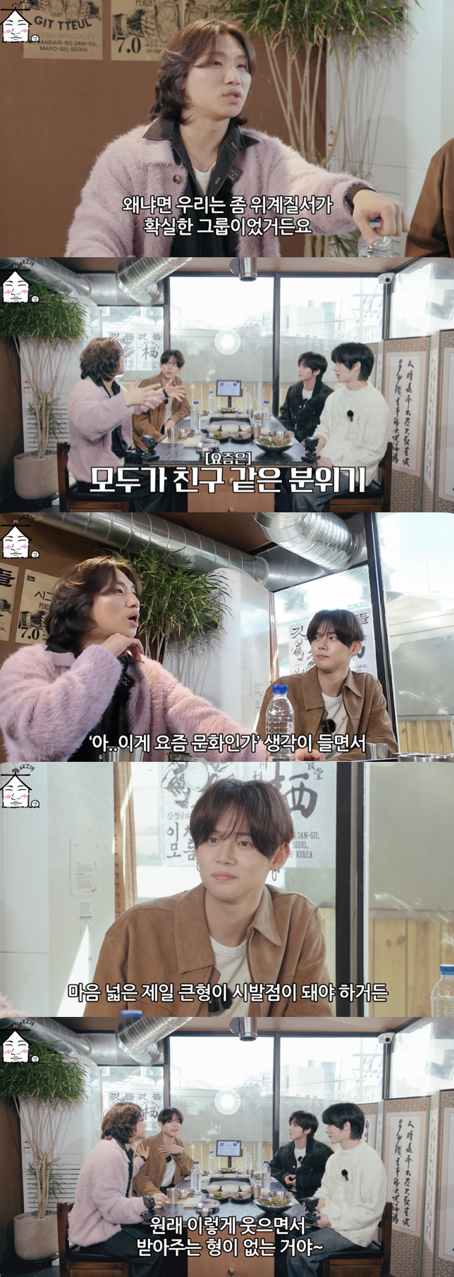 이에 대성은 "저는 그게 신기하더라. 우리는 좀 위계질서가 확실한 그룹이었다. 요즘 (그룹들은 나이 차가 나는 멤버들끼리도) 되게 잘 지내더라. '아, 이게 요즘 문화인가?'라는 생각이 들면서 그거의 시발점은 마음 넓은 제일 큰 형이 시발점이 되어야 한다"라고 자신의 생각을 이야기했다.