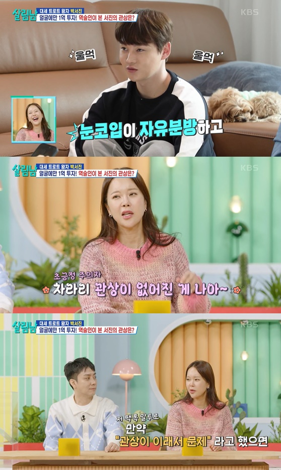 박서진이 1억 성형 후 인생 처음 관상을 봤다. 성형한 얼굴로는 관상을 보기 힘들다는 말에 백지영은 "너나 나나 관상은 못본다" 팩폭해 웃음을 자아냈다.