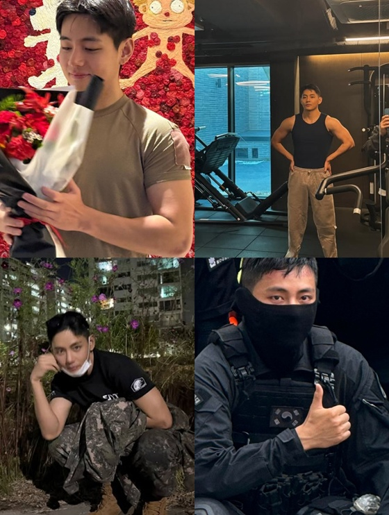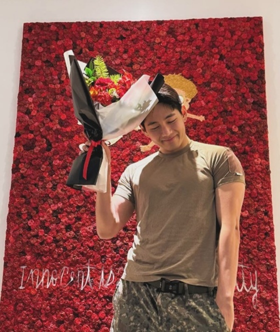 공개된 사진 속 그는 꽃다발을 안고 미소 짓고 있다. 꽃보다 훈훈한 비주얼이 눈길을 끈다. 특히 운동으로 벌크업된 탄탄한 근육을 보여주며 군백기 중에도 자기관리를 끝판왕을 보여줬다. 또 가수 박효신과 친분도 잊지 않았다.