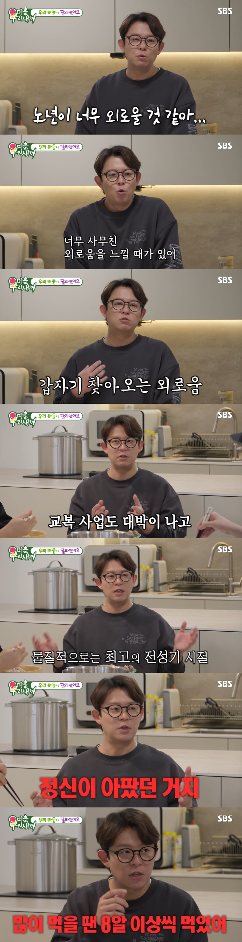 그는 "어느 순간부터 내 힘든 얘기를 안 하고 친구들도 안 보게 되더라. 친했던 매니저와도 대표와 직원 관계가 디ㅗ면서 사이가 어색해졌다. 다 이루고 보니까 사람이 없더라. 그 때부터 혼술을 하게 됐다"고 말했다.