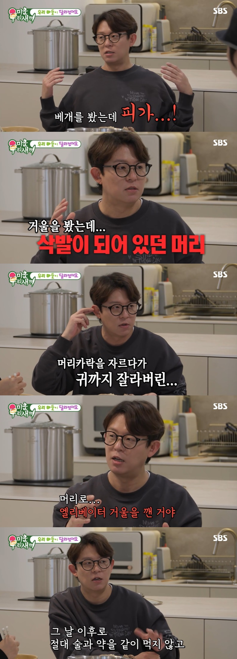 그는 "너무 당황스러웠는데 관리실에서 전화가 왔다. '토니 씨 괜찮으시냐'라고 하더라. '무슨 일이냐'고 했더니 '어제 집에 들어가면서 머리로 엘리베이터 거울을 다 깼다는 거다. 그래서 머리에서 출혈이 난 거다. 이렇게 죽을 수 있다는 걸 알게 됐다"고 말했다.