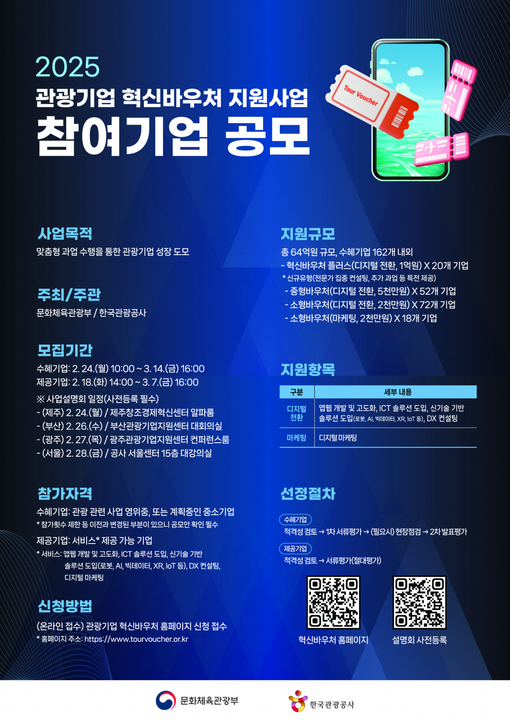 문화체육관광부와 한국관광공사(이하 공사)는 중소 관광기업의 혁신 성장을 위해 2월 24일부터 3월 14일까지 '2025 관광기업 혁신바우처 지원사업'의 수혜기업을 모집한다.