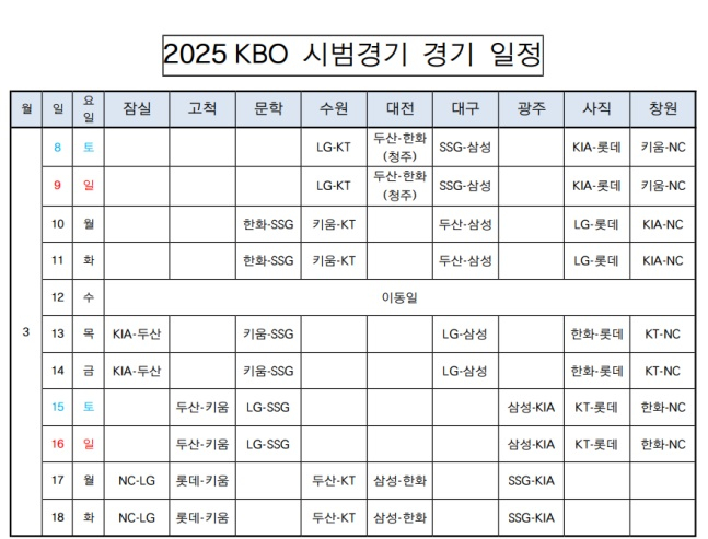 2025 KBO 시범경기 일정. /표=KBO 제공