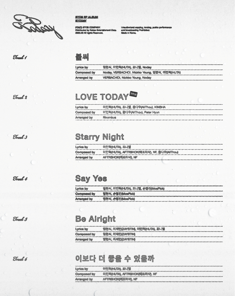 트랙리스트에 따르면 비투비의 새 앨범 타이틀곡은 '러브 투데이(LOVE TODAY)'다. 이 외에도 '스태리 나잇(Starry Night)', '세이 예스(Say Yes)', 그리고 지난해 '비커밍 프로젝트(BECOMING PROJECT)'를 통해 공개한 '불씨', '비올라잇(Be Alright)', '이보다 더 좋을 수 있을까'까지, 비투비의 감미로운 음색과 짙은 음악색을 확인할 수 있는 총 6곡이 다채롭게 수록됐다.