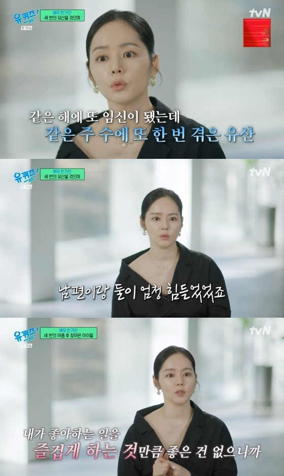 그러나 한가인이 지난 26일 방송된 tvN 예능 프로그램 '유 퀴즈 온 더 블럭'(이하 '유퀴즈')에 출연해 자신의 유산 사실을 고백해 많은 시청자가 그에게 위로와 응원을 전하게 됐다.