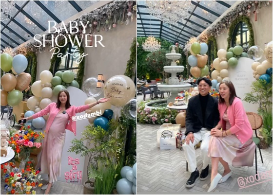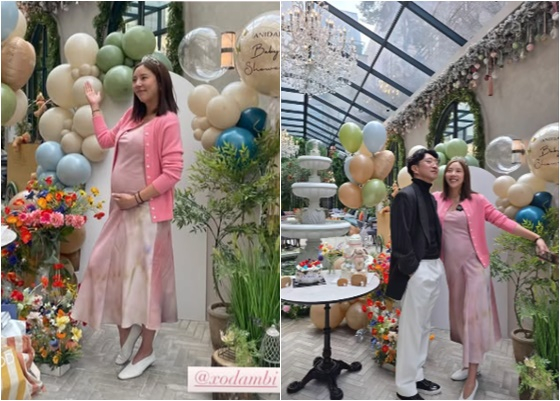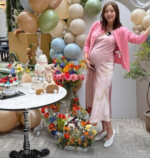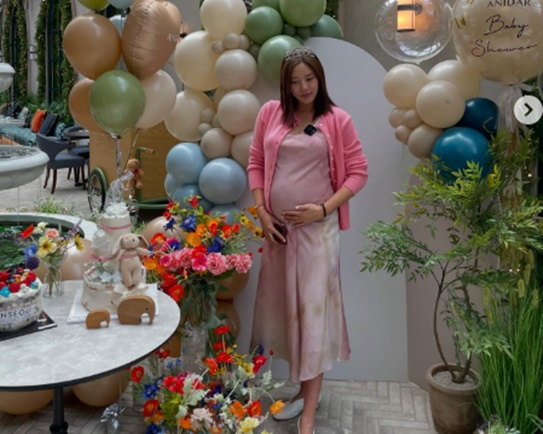 손담비는 28일 자신의 인스타그램에 베이비샤워 사진을 게재했다. 공개된 사진 속 손담비는 파티 장소를 빌려서 화려한 장식과 함께 베이비 샤워를 했다. 손담비는 핑크색 드레스를 입고 있으며 남편 이규혁도 차려입은 모습.