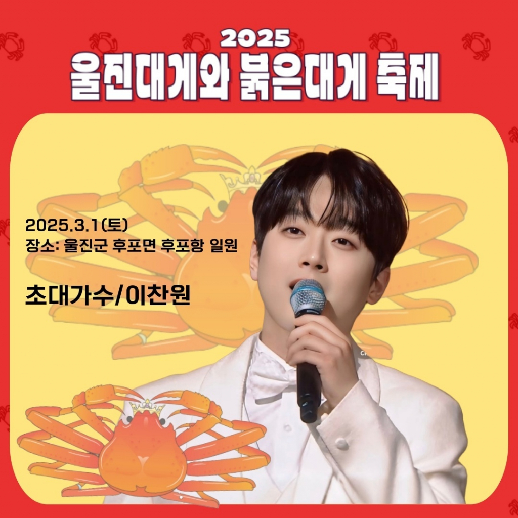 이찬원은 3월 1일 오후 5시 30분 경북 울진군 후포항 일원에서 열리는 '2025 울진대게와 붉은대게 축제' 개막식 무대에 오른다.