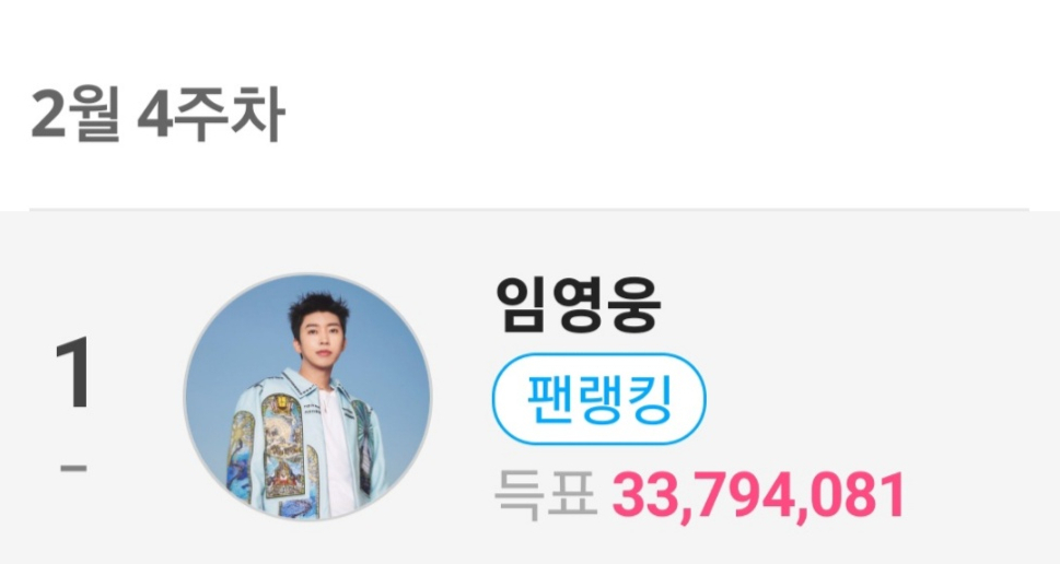 임영웅은 2025년 2월 4주차 팬앤스타 솔로 랭킹에서 3379만 4081표를 획득해 1위를 기록했다.