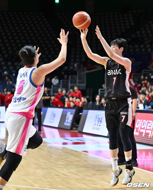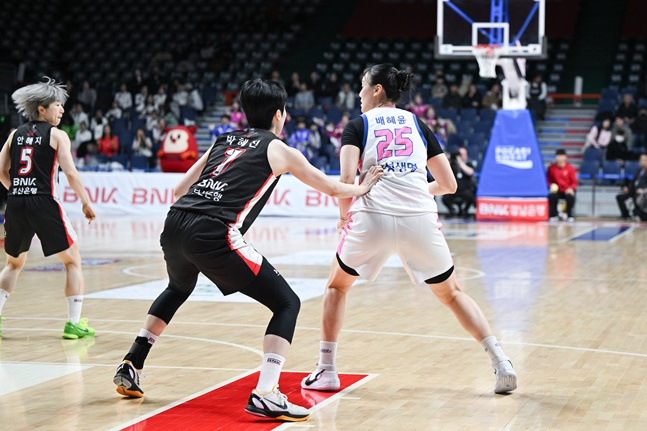 BNK는 3일 오후 2시 부산 사직실내체육관에서 열린 용인 삼성생명 블루밍스와 하나은행 2024~2025 여자프로농구 플레이오프(5전 3선승제) 1차전에서 66-57 승리를 거뒀다.