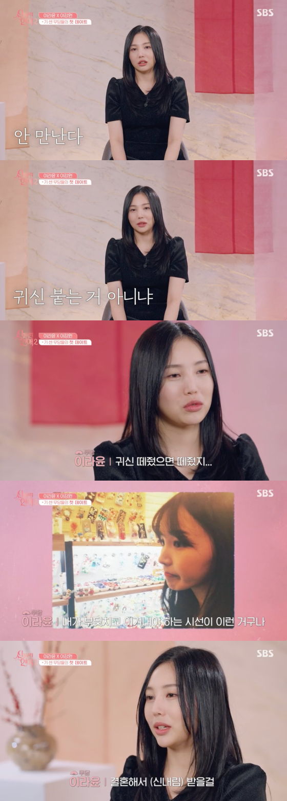 이날 이라윤은 제작진과 인터뷰에서 "예전에 소개팅이 들어왔는데 상대 남자가 내 직업을 듣고는 '안 만난다. 귀신 붙는 거 아니냐'고 했다더라"고 밝혔다.