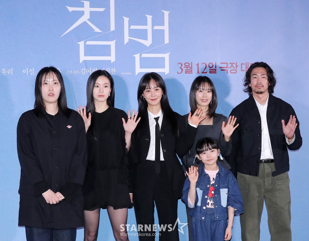 김여정, 이정찬 감독, 배우 이설, 권유리, 곽선영, 아역배우 기소유가 5일 오후 서울 용산구 아이파크몰 CGV에서 진행된 영화 '침범' 언론시사회 및 기자간담회에 참석해 포즈를 취하고 있다.
