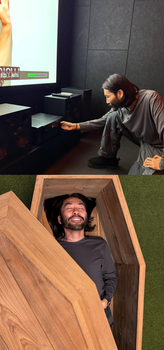 또 다른 사진 속 그는 관에 누워 미소를 짓고 있어 눈길을 끌었다.