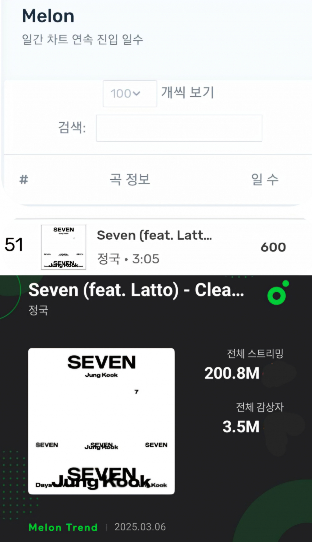 정국이 2023년 7월 발매한 'Seven'은 3월 6일 기준 멜론 메인 차트 TOP 100에 600일 연속 차트인했다.