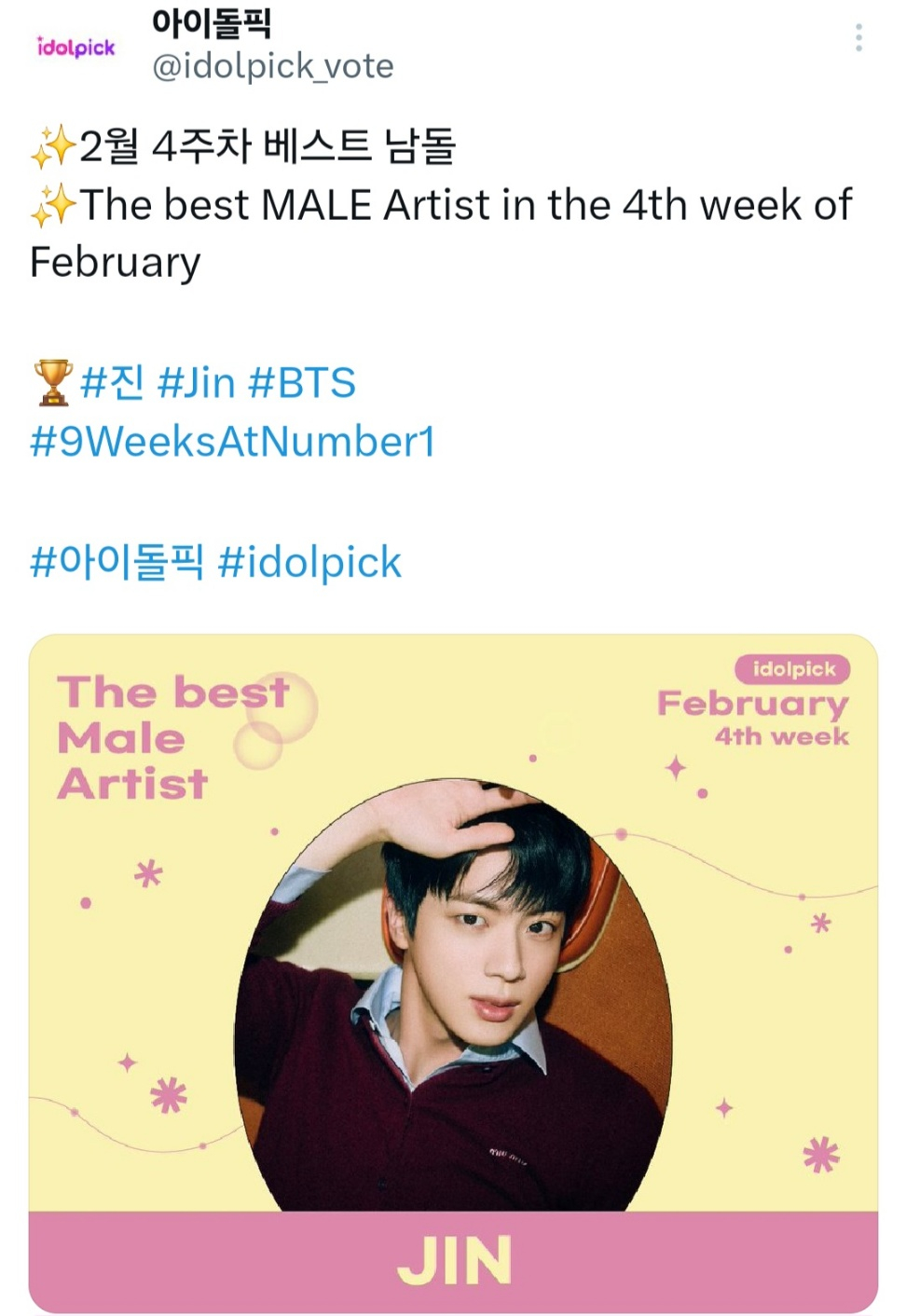 방탄소년단(BTS) 진이 아이돌픽(idolpick) 위클리 투표에서 최다 득표수로 1위를 차지하며 '2월의 베스트 아이돌'로 선정됐다.