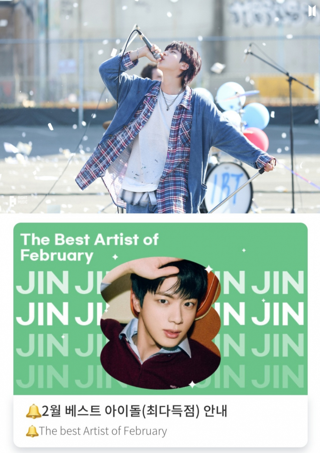 진은 2월 4주차 위클리 투표 마감으로 2월 한 달 동안 남자 아이돌 개인 부문에서 총 누적 31만 6799픽을 획득해 월간 1위를 차지했다. 이는 전체 부문을 통틀어 월간 최다 득표로 진은 '2월의 베스트 아이돌'로 선정되는 영예를 안았다. 1위를 차지한 진의 리워드 광고는 수도권 지하철 7개역에 3월 10일부터 4월 13일까지 한 달간 송출될 예정이다.