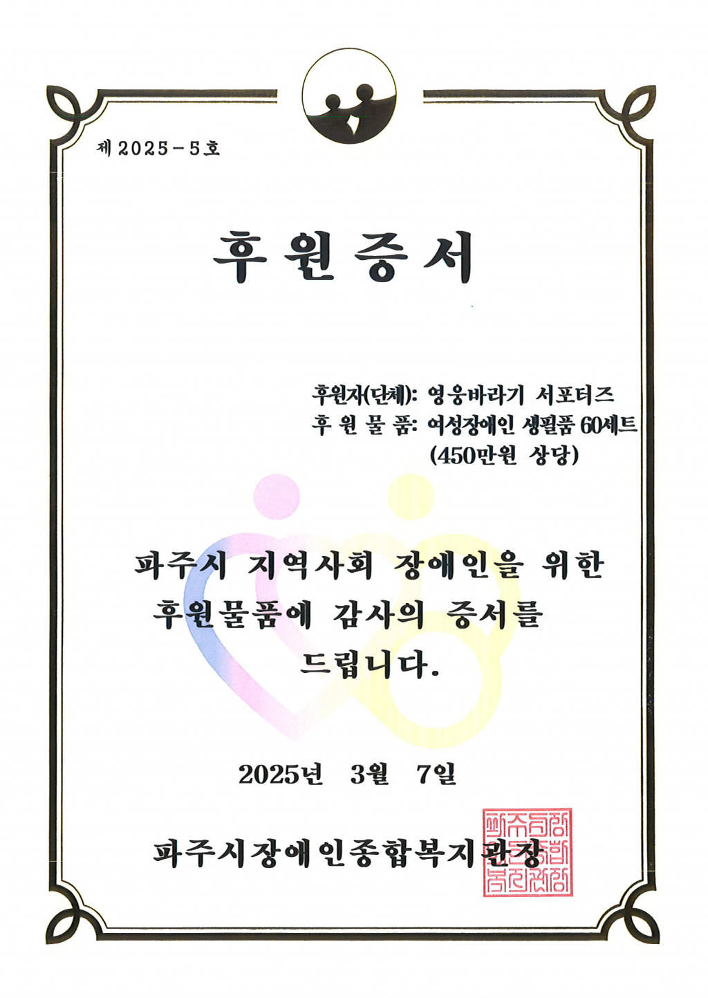 파주시장애인종합복지관 홍정숙 관장은 "임영웅 팬클럽의 따뜻한 마음에 감사드리며, 전달된 생필품은 지역 여성 장애인들에게 큰 도움이 될 것"이라며 고마움을 나타냈다.