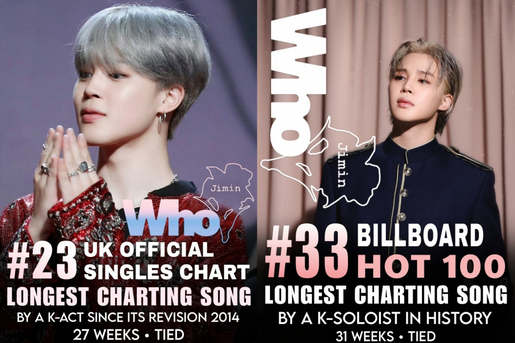 방탄소년단(BTS) 지민이 세계 양대 팝 차트에서 최장 차트인을 기록하며 솔로 가수 커리어를 빛냈다.