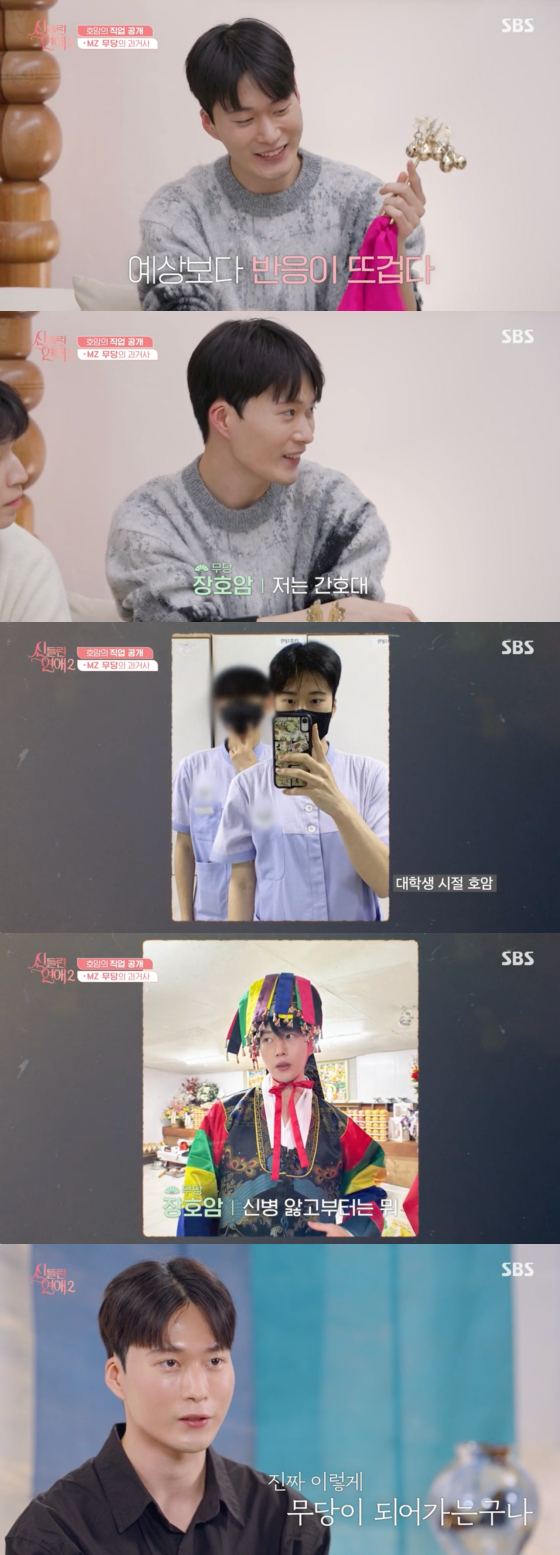 장호암은 "간호대를 다녔다. 졸업은 못 했다. 무당이 되고 싶어서 되는 사람은 없지 않나. 많이 힘들었다. 신병이 되게 일찍 와서 억울하더라. 4년을 도망쳐 다니다가 신내림을 받았다. 점점 인간 장호암은 없어지고 운명이라는 생각으로 일을 하고 있다"고 밝혔다.