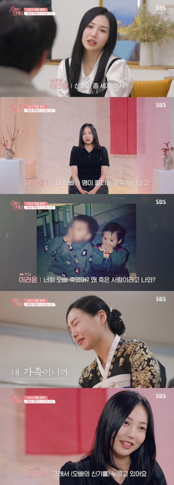11일 방송된 SBS 예능 프로그램 '신들린 연애 2'에서는 이라윤이 무당이 되기로 결심한 이유가 밝혀졌다.