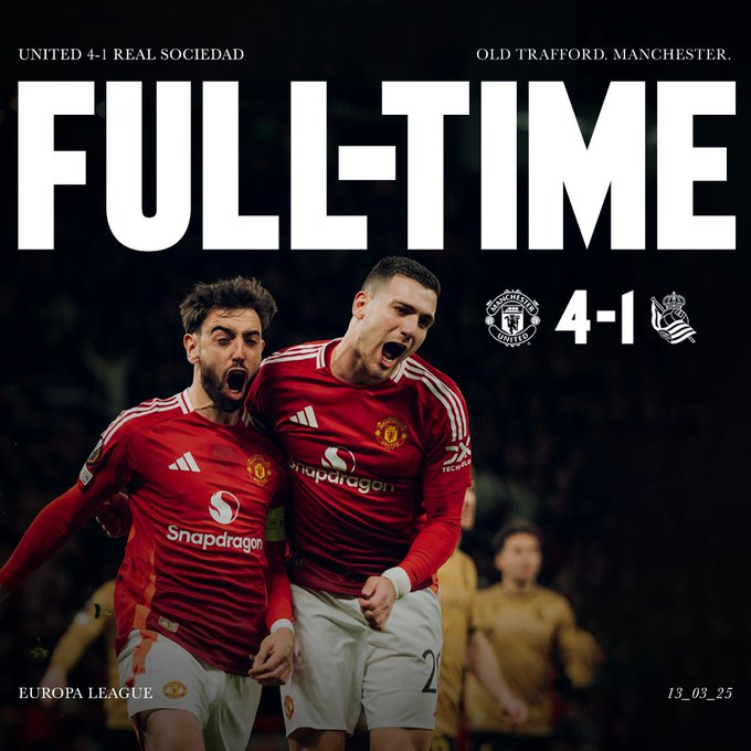 맨유는 14일(한국시간) 영국 맨체스터의 올드 트래포드에서 열린 2024~2025시즌 유럽축구연맹(UEFA) 유로파리그(UEL) 16강 2차전에서 레알 소시에다드(스페인)를 4-1로 크게 이겼다.