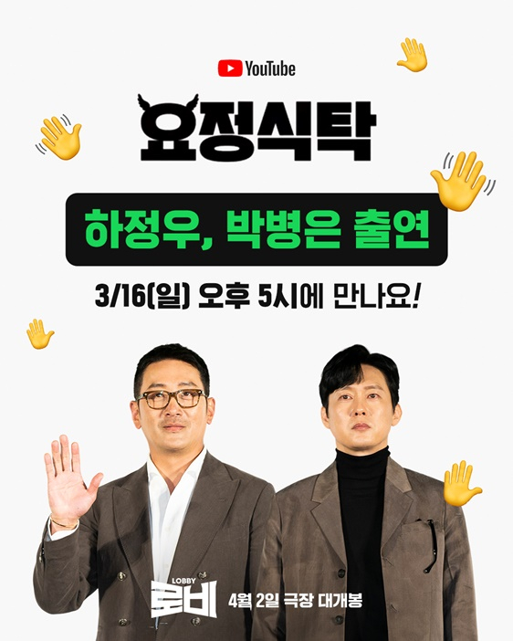 '로비'의 팀 대표 하정우와 박병은은 오는 16일 공개되는 유튜브 '요정재형'에 홍보 나들이를 나선다.