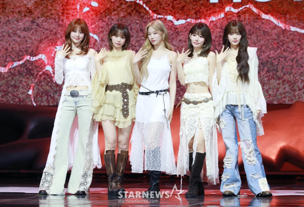 걸그룹 르세라핌(LE SSERAFIM)이 14일 오전 서울 광진구 예스24라이브홀에서 진행된 미니 5집 ‘HOT’ 발매기념 쇼케이스에서 포즈를 취하고 있다.