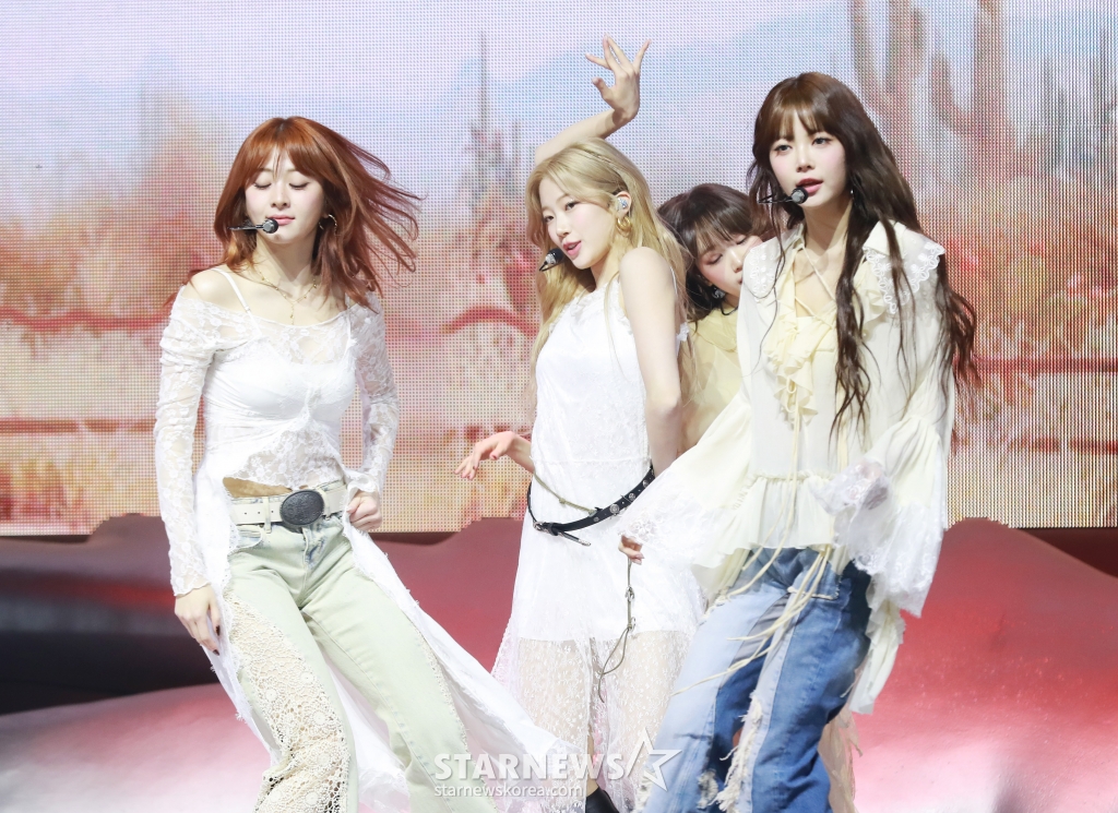 걸그룹 르세라핌(LE SSERAFIM)이 14일 오전 서울 광진구 예스24라이브홀에서 진행된 미니 5집 ‘HOT’ 발매기념 쇼케이스에서 신곡을 선보이고 있다.