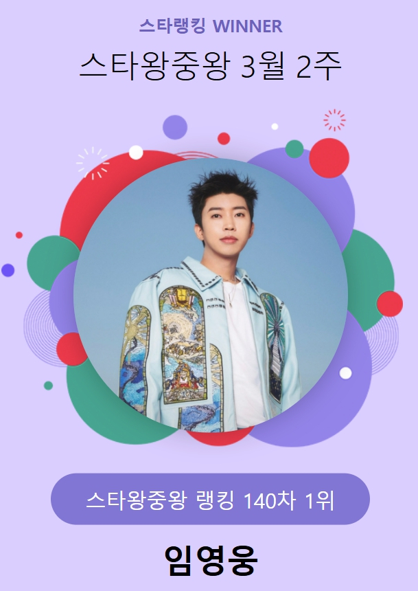 임영웅은 지난 7일 오후 3시 1분부터 14일 오후 3시까지 진행된 3월 2주(140차) 스타왕중왕 랭킹 투표에서 17만 94표를 얻고 1위에 올랐다.