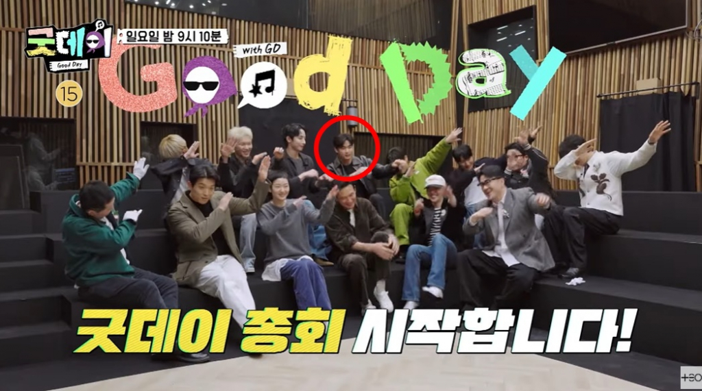김수현은 녹음실 전체 모임 멤버 중에서도 한 가운데에 앉아있어 '굿데이' 제작진이 편집에 난항을 겪은 것으로 보인다.
