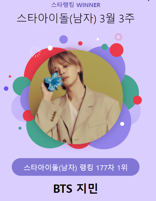 지민은 지난 13일 오후 3시 1분부터 20일 오후 3시까지 진행된 3월 3주(177차) 스타랭킹 스타아이돌 남자 부문 랭킹 투표에서 4만4403표를 받으며 1위에 올랐다.