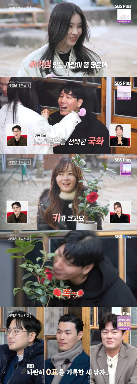 국화는 "배려심 있는 사람이 좋다. 그분이 남을 잘 배려하는 모습이 보여져서 그분을 첫인상 선택했다"면서 14기 경수를 선택했다.