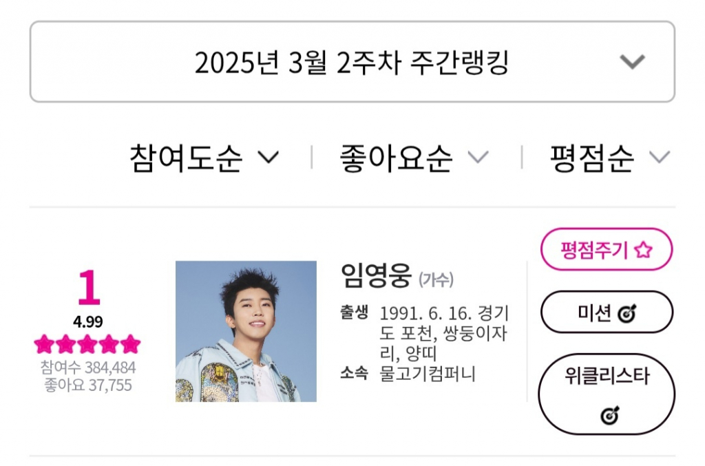 임영웅은 3월 2주차 아이돌차트 평점랭킹에서 38만 4484표를 얻어 1위를 차지했다.