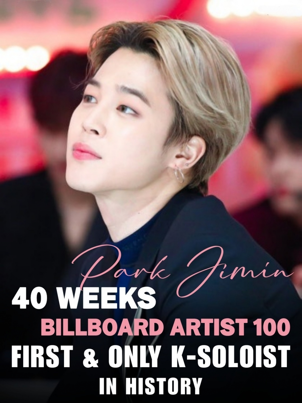 빌보드 메인 싱글 차트인 '핫100'에서 K팝 최고 순위(1위)와 최장 진입(33주) 신기록을 보유하고 있는 지민은 K팝 솔로 가수로 빌보드 '아티스트 100' 차트에서 역시 최고 순위(1위)와 최장 진입(40주) 기록을 동시 보유하며 독보적인 활약을 보이고 있다.
