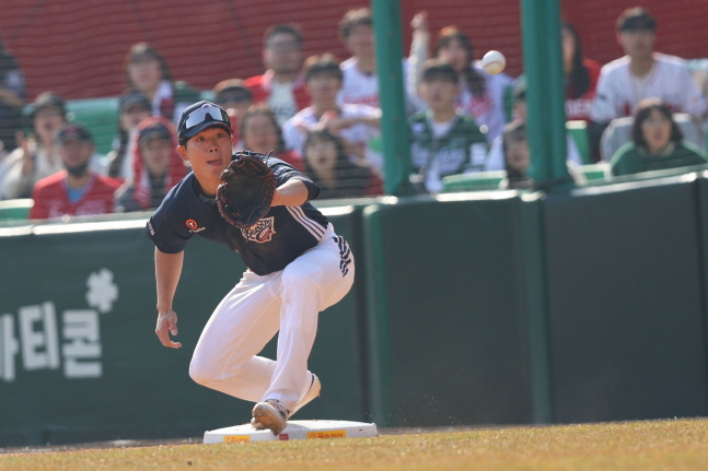 전날 침묵하며 정규리그는 또 다르다는 걸 경험한 상황에서 좌투수 김광현을 상대로 좋은 성적을 기대하기 쉽지 않아 보인 건 사실이다. 오명진은 시범경기에서 맹타를 휘둘렀지만 우투수 상대 타율은 0.435로 빼어났지만 좌투수(0.250)에겐 확연히 차이를 나타냈다.