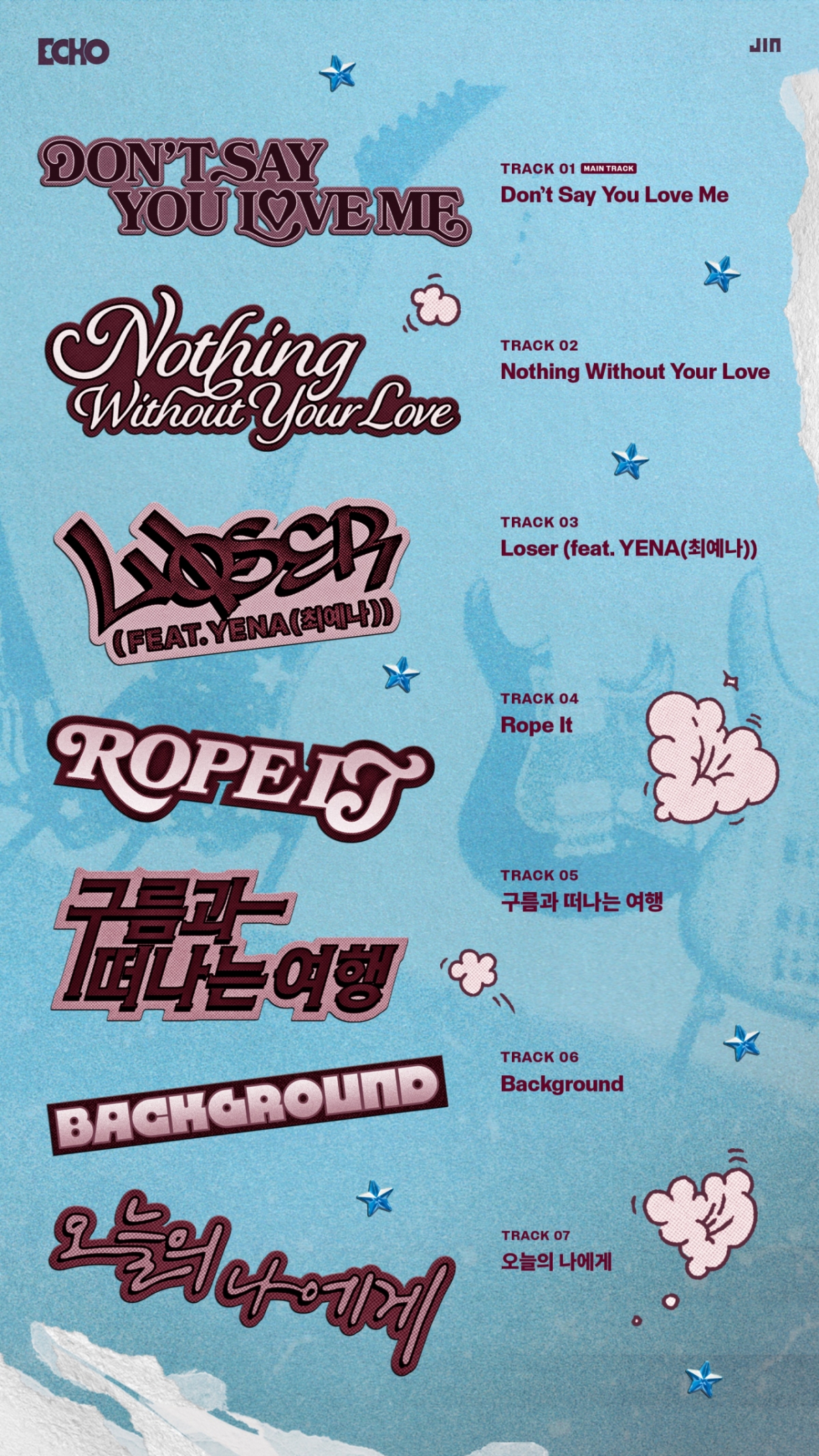 진은 17일 0시(이하 한국시간) 팀 공식 SNS에 미니 2집 'Echo'의 트랙리스트를 게재했다. 이번 앨범에는 타이틀곡 'Don't Say You Love Me'를 비롯해 'Nothing Without Your Love', 'Loser (feat. YENA(최예나))', 'Rope It', '구름과 떠나는 여행', 'Background', '오늘의 나에게' 등 총 7곡이 수록됐다.