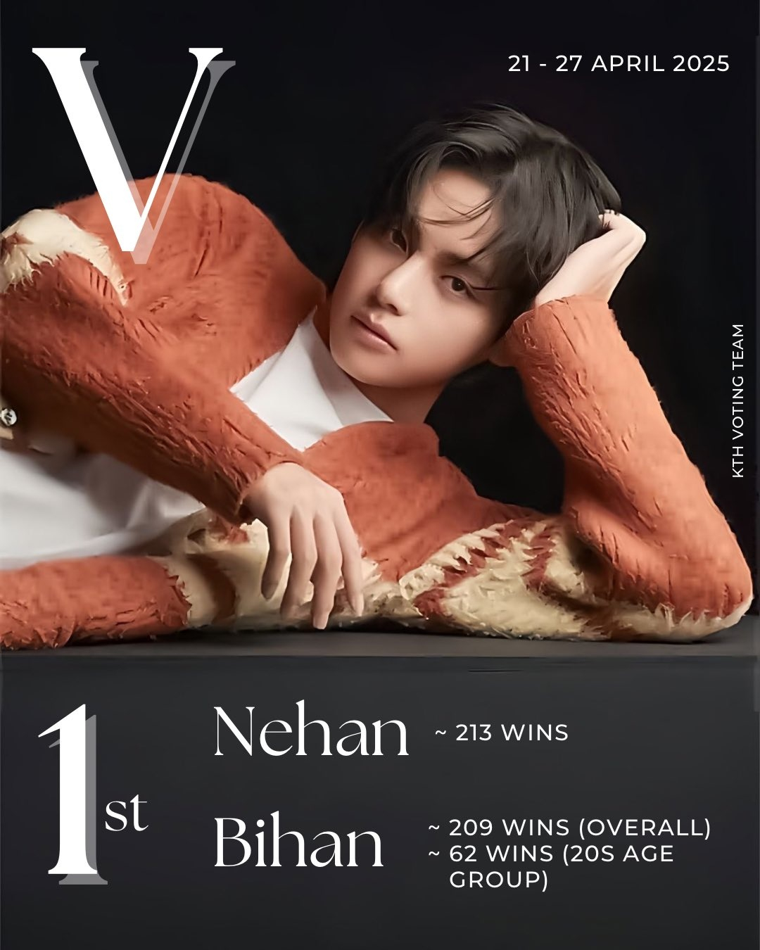 뷔는 2025년 4월 21일부터 4월 27일까지 일본 인기 아이돌 랭킹 사이트 '네한'(NEHAN)에서 실시한 남자 아이돌 랭킹 투표에서 213주 연속 1위 기록을 경신했다.