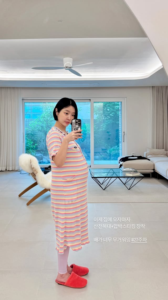 공개된 사진 속에는 집에서 임신 27주 차 D라인을 뽐내고 있는 레이디 제인의 모습이 담겼다. 그는 점점 불러오는 배로 인해 허리 통증 등을 느껴 산전 복대, 압박 스타킹을 착용한 것으로 보인다.