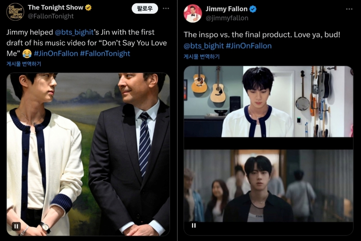 미국의 최고 인기 진행자이자 코미디언인 지미 팰런 또한 자신의 공식 X(옛 트위터) 계정에 "영감 vs. 완성된 작품. 사랑해, 친구!"라는 문구와 #JinOnFallon 해시태그와 함께 진과 촬영한 'Don't Say You Love Me' 뮤직비디오를 공개했다.