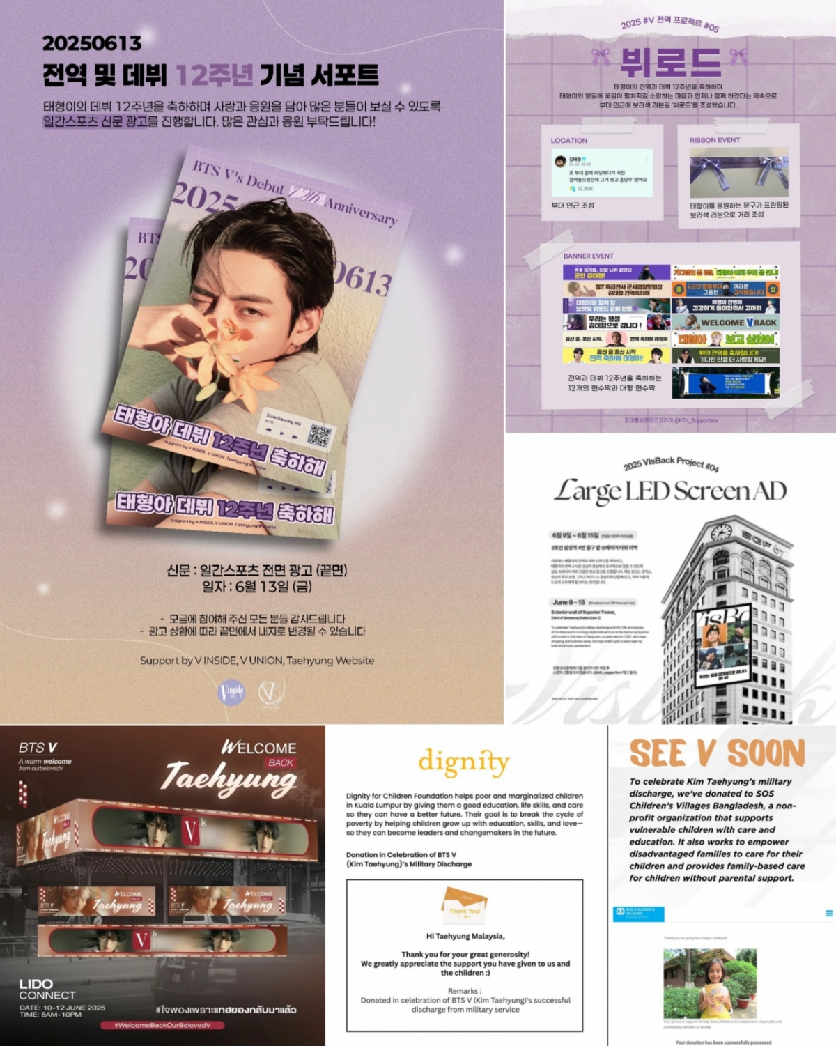 김태형서포터즈코리아는 서울 지하철 2호선 삼성역에 위치한 대형 빌딩의 LED 광고판에 뷔의 전역과 데뷔 12주년을 축하하는 광고를 서포트를 송출하고 있다. 또 뷔의 부대인 춘천의 쌍용부대를 중심으로 축하 현수막과 함께 보라색 리본길 '뷔로드'를 조성한다고 밝혔다.