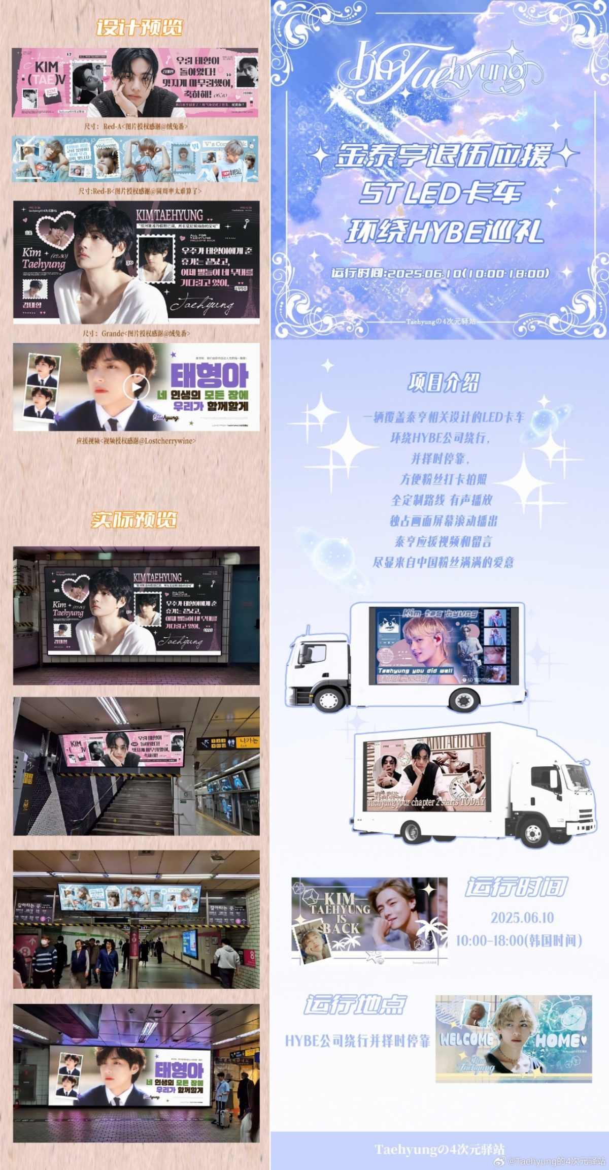 뷔의 중국 팬들은 서울 지하철 전 노선의 대형 스크린에 뷔의 전역을 축하하는 영상을 송출한다. 지하철 1호선에서 8호선까지, 54개 역에 있는 120개 스크린에 "네 인생의 모든 순간 우리가 함께 할게"라는 메시지가 뷔에게 닿기를 바라는 마음을 담았다.