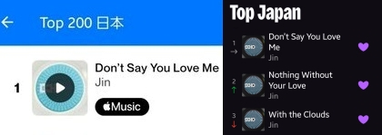 진의 'Don't Say You Love Me'는 세계 최대 음원 검색 플랫폼인 샤잠(Shazam)에서도 폭발적인 인기를 보이고 있다. 특히 샤잠 재팬에서 최신 차트까지 28일째 1위를 기록 중이다. 디저(Deezer) 재팬에서도 역시 장기간 1위(6월 16일 자)를 기록했으며 진의 'Nothing Without Your Love'(낫띵 위드아웃 유어 러브)는 2위, '구름과 떠나는 여행'(With the Clouds)이 3위를 차지했다. 또한 진의 'Echo' 전곡인 7곡 모두 줄 세우기로 차트인했다.