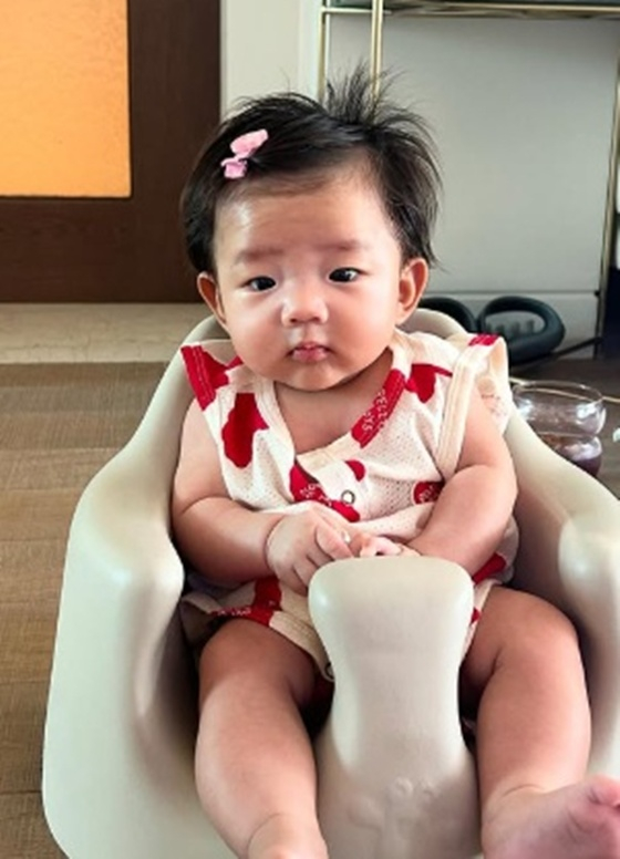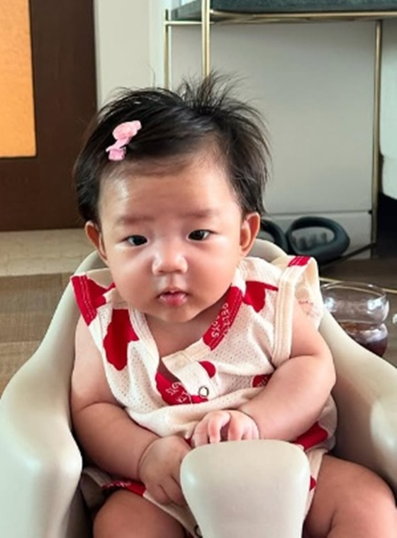 공개된 사진 속에는 아기 의자에 앉아 있는 해이의 모습이 담겼다. 머리에 분홍색 핀을 꽂고 카메라를 응시하고 있는 해이는 귀여움을 자아낸다.