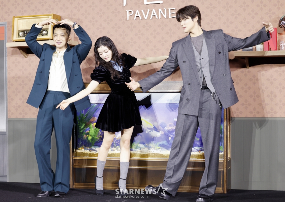 Ngày 12/4, các diễn viên Byun Yo Han, Go Ah Sung và Moon Sang Min đang tạo dáng tại buổi họp báo ra mắt phim điện ảnh Fabanne diễn ra tại COEX, Gangnam-gu, Seoul. /2026.02.12