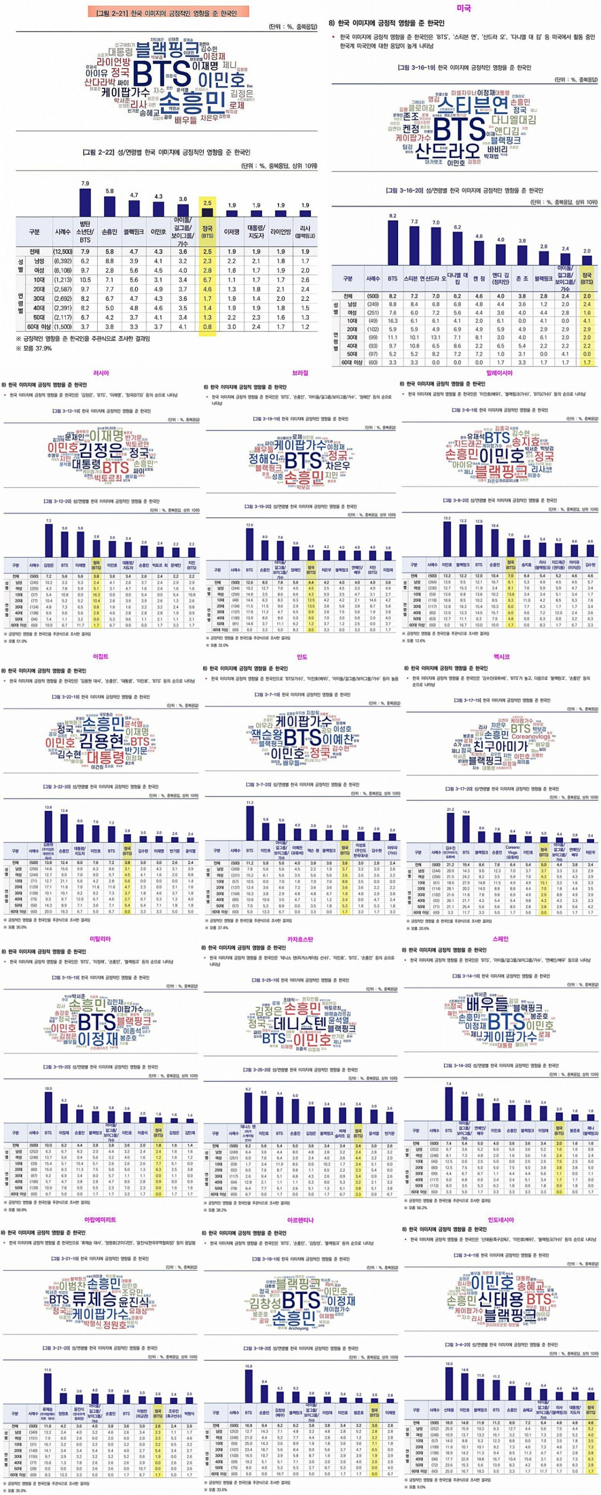 Tính theo quốc gia, nó xếp thứ 4 tại Nga, thứ 5 tại Brasil, thứ 5 tại Malaysia, thứ 6 tại Ai Cập, thứ 7 tại Ấn Độ, thứ 7 tại Mexico, thứ 8 tại Ý, thứ 8 tại Kazakhstan và các tiểu vương quốc Ả Rập Thống nhất. Ông được xác nhận là người đã góp phần nâng cao hình ảnh Hàn Quốc tại 13 trong số 25 quốc gia khảo sát.