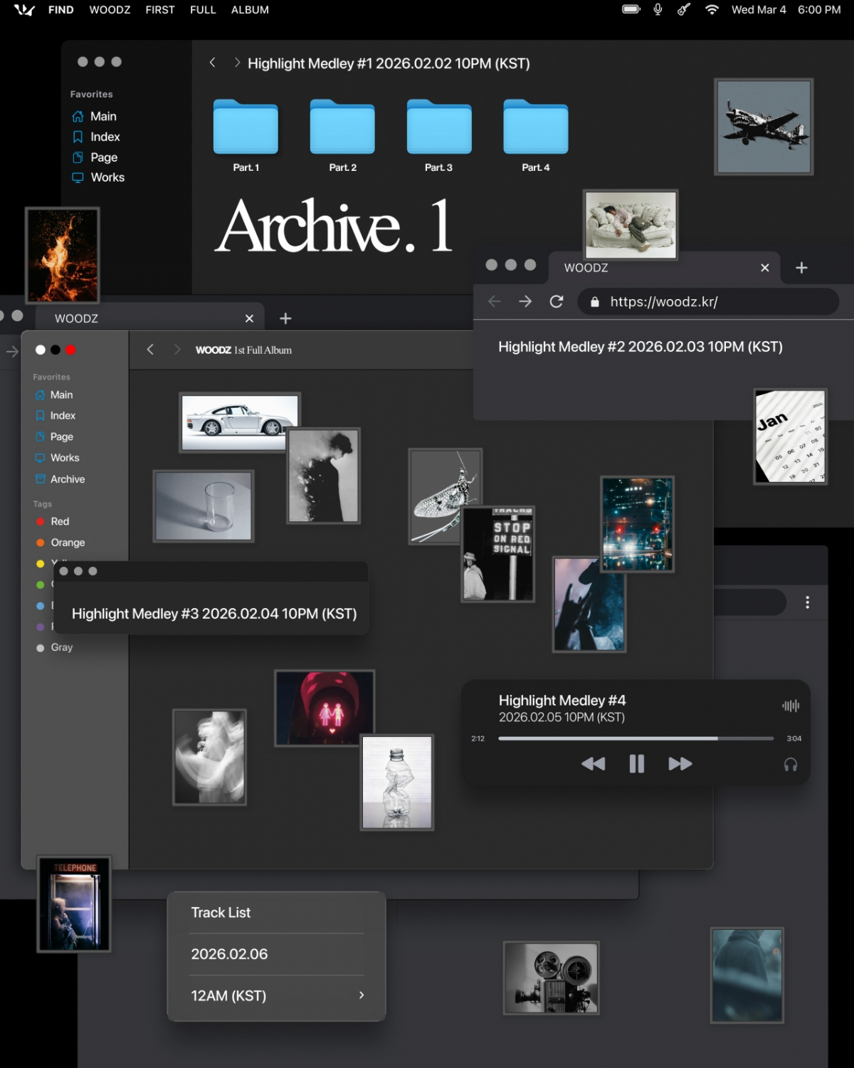 Mặt khác, ca khúc phát hành trước của Woods sẽ được phát hành thông qua các trang nhạc trực tuyến vào ngày 12/2 và full album đầu tay Archive.1 sẽ được phát hành vào ngày 4/3.