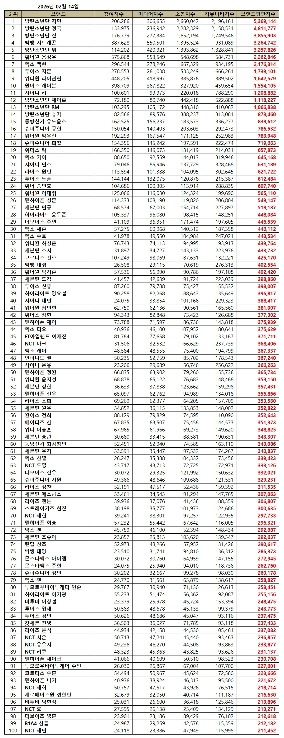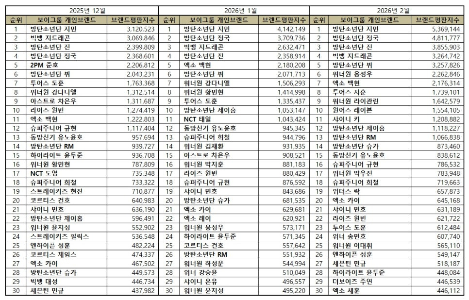 Tháng 2 năm 2026, các thương hiệu đứng thứ 100 trong bảng đánh giá thương hiệu cá nhân của nhóm nhạc nam như BTS Jimin, BTS Jungkook, BTS Jin, Big Bang G-Dragon, BTS V, Wanna One Ong Seongwu, EXO Baekhyun, Tours Jihoon, WANNA ONE LAVENNIS LAVENNISHINNISHANSKYUNHYUNHYUNHYUNHYUNHYUNHYUNHYEONG WANNABENEWANSHIONEYONG WANNAZE9 và WANNAZENEWIZENEWANTWANTWANTASIZENE Seventeen Dokyeom, Tours Shinyu, Highlight Yang Yoseob, SHINee Tae Min, Wanna One Hwang Min Hyun, Withers Jang Hyun, ENHYPEN J, EXO Lay, Infinite L., SHINee Onew (SHINee), Wanna One Yoon Ji Sung (Seventeen Jeong Woo), ENHYPEN Jeong Woo (Shinhee), Rise So Hee (Seasonies), The Boyz Sunghoon (Seventeen), Seung-chan (Seventeen), Seung-chan (Seventeen), The Boyz), Seung-Shownpourner. Jooheon (Monsta X), Sungmin (Super Junior), Chen (EXO), Yeonjun (TXT), Lee Gikwang (Highlight), Lee Changsub (BTOB), Youngjae (TXT), Kyungmin (BTOB), Jinyoung, Rise, LEEZE, LEEZE, LEEZE, ENHYPEN, JOOK, KOT7 JOOHYUN, JOOHINOONEYONGHINOONYEONJUNISTER: NCT BINNIE.NIE.NISHINNIE.NIE.NIE. NCT BEST WOOKS: NCT BESTIVINNIE.